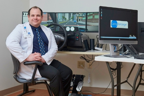 Behavioral neurologist Glen Finney, M.D., director of the Memory and Cognition Program at Geisinger, demonstrates the driving simulator at the center, 620 Baltimore Drive, Wilkes-Barre.