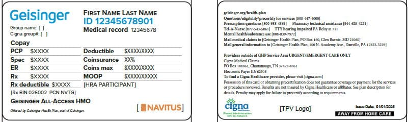 ID cards above are not inclusive of all Geisinger Health Plan ID card types. Geisinger Health Plan ID cards will include the Cigna Healthcare logo and claim submission information, when applicable. Self-funded plan sponsor ID cards may contain the plan sponsor logo.
